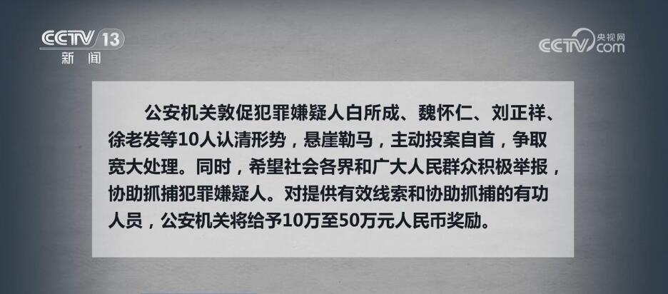 公安機(jī)關(guān)敦促犯罪嫌疑人白所成、魏懷仁、劉正祥、徐老發(fā)等10人認(rèn)清形勢,懸崖勒馬,主動(dòng)投案自首,爭取寬大處理。同時(shí),希望社會(huì)各界和廣大人民群眾積極舉報(bào),協(xié)助抓捕犯罪嫌疑人。對提供有效線索和協(xié)助抓捕的有功人員,公安機(jī)關(guān)將給予10萬至50萬元人民幣獎(jiǎng)勵(lì)。