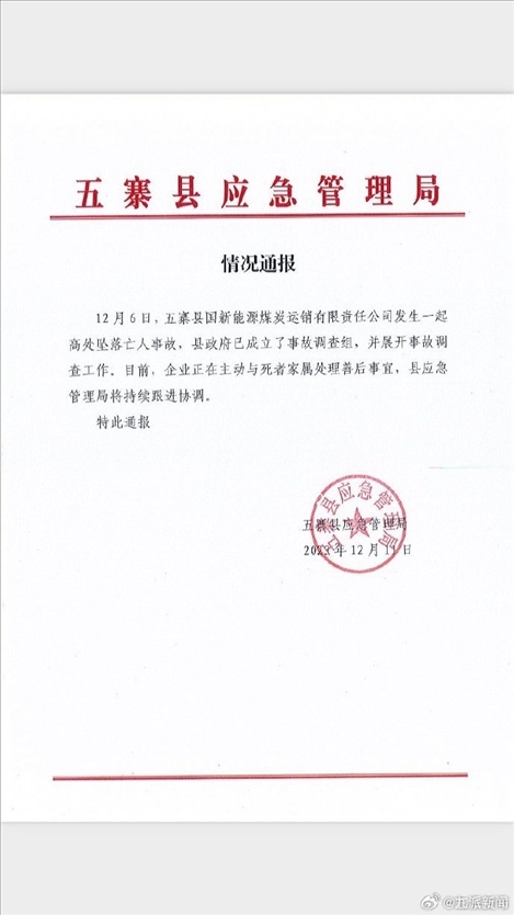 ·國(guó)新能源煤炭運(yùn)銷(xiāo)公司發(fā)生墜亡事故,山西省忻州市五寨縣官方:展開(kāi)調(diào)查。