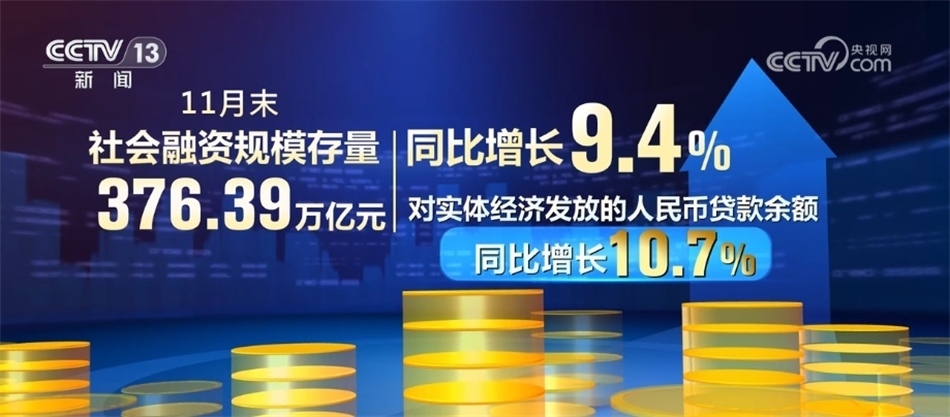 11月末社會融資規(guī)模存量為376.39萬億元,同比增長9.4%。其中,對實體經(jīng)濟發(fā)放的人民幣貸款余額同比增長10.7%。11月份社會融資規(guī)模增量為2.45萬億元,比上年同期多4556億元。