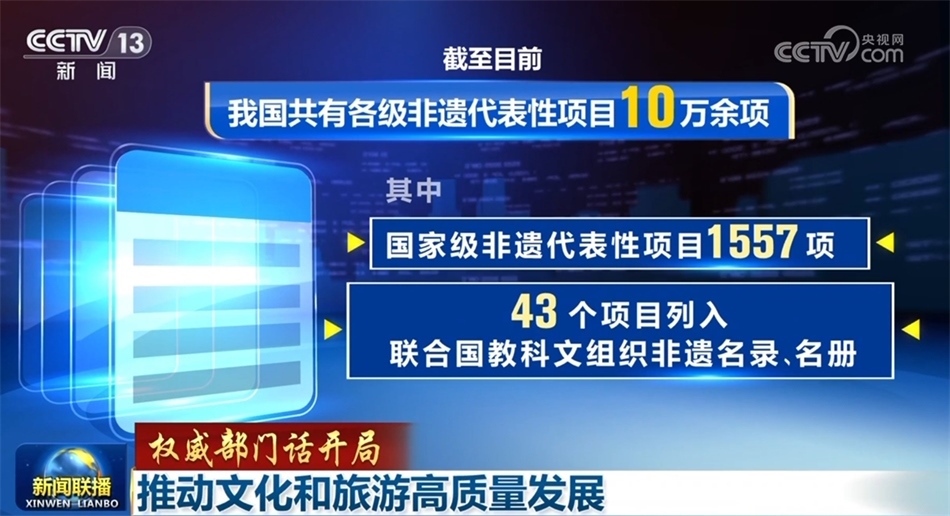繁榮發(fā)展文化事業(yè)和文化產(chǎn)業(yè),推進城鄉(xiāng)公共文化服務(wù)體系提質(zhì)增效。今年前11個月,文化和旅游部主辦27項展演展示活動,線下觀眾90萬人次,線上觀看量超過18億次,一批彰顯中華審美風范、富有鮮明時代氣息的舞臺藝術(shù)作品廣受好評。保護傳承弘揚中華優(yōu)秀傳統(tǒng)文化,中華文明探源工程、考古中國等重大項目得以深入實施,截至目前,我國共有各級非遺代表性項目10萬余項,其中國家級非遺代表性項目1557項,43個項目列入聯(lián)合國教科文組織非遺名錄(名冊),中國世界遺產(chǎn)數(shù)量增至57項。