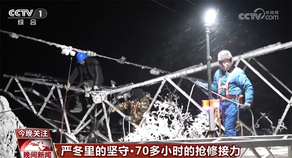 總臺(tái)記者 崔肖冉:這里的海拔超過(guò)1200米,現(xiàn)在室外氣溫降至零下20℃,感覺(jué)進(jìn)入了一個(gè)冰窖。我在室外大概走上15分鐘左右,就感覺(jué)整個(gè)關(guān)節(jié)凍得發(fā)疼,而此時(shí)此刻在距離地面大概20多米的高空,維修人員正在輸電線路上進(jìn)行緊急搶修,而且今天晚上風(fēng)很大,可想而知搶修難度有多大。