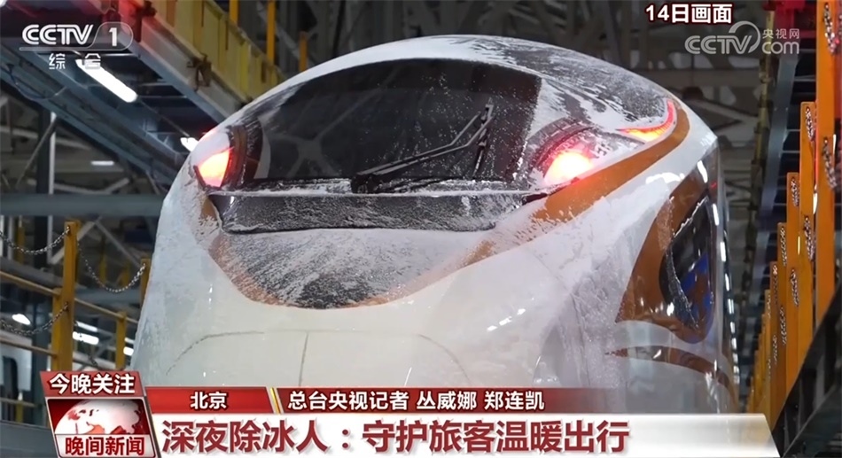 持續(xù)的雨雪冰凍天氣不僅影響公路安全,也對(duì)高鐵動(dòng)車(chē)運(yùn)行造成一定影響。晚上11點(diǎn),在北京西和雄安站間運(yùn)行一天的C2727次列車(chē)完成任務(wù),入庫(kù)檢修,車(chē)頭上頂著厚厚的冰塊。