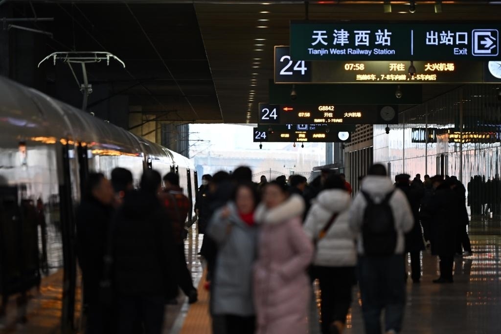 12月18日,G8842次列車??吭谔旖蛭髡菊九_(tái)。新華社記者李然攝