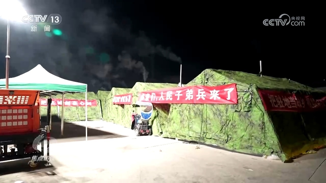 凌晨4時,室外的溫度達到了零下13℃左右,安置點的每一頂帳篷里面都有一個取暖爐,取暖爐可以保證室內(nèi)的溫度,保證受災(zāi)群眾基本取暖需求。水果、飲料、榨菜、泡面這些基本應(yīng)急物資都有提供,還有一臺炊事車,部隊的炊事車可以提供熱食,像做米飯、饅頭,包括一些炒菜、湯都可以實現(xiàn),可以滿足受災(zāi)群眾的一日三餐,滿足他們的基本用餐需求。