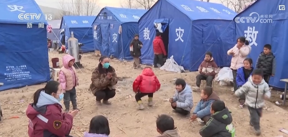 在康吊村三社的臨時(shí)安置點(diǎn),來自甘肅省第二人民醫(yī)院的心理治療師李轉(zhuǎn)雄正帶著村里的孩子做游戲。丟手絹、老鷹抓小雞,在一遍又一遍的追逐當(dāng)中,孩子們的笑聲越來越響亮。