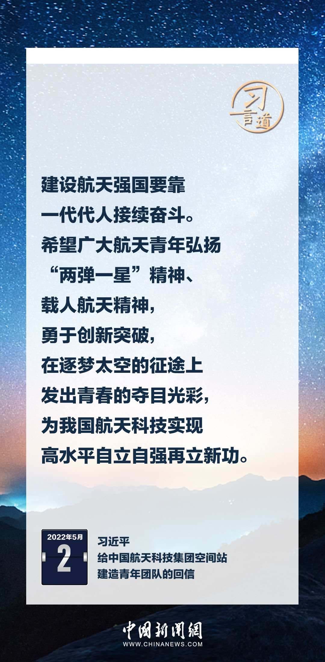 建設(shè)航天強國要靠一代代人接續(xù)奮斗。在不同場合,習(xí)近平總書記頻頻提及航天精神,激勵一代代中國人不斷奮進(jìn)、筑夢太空。