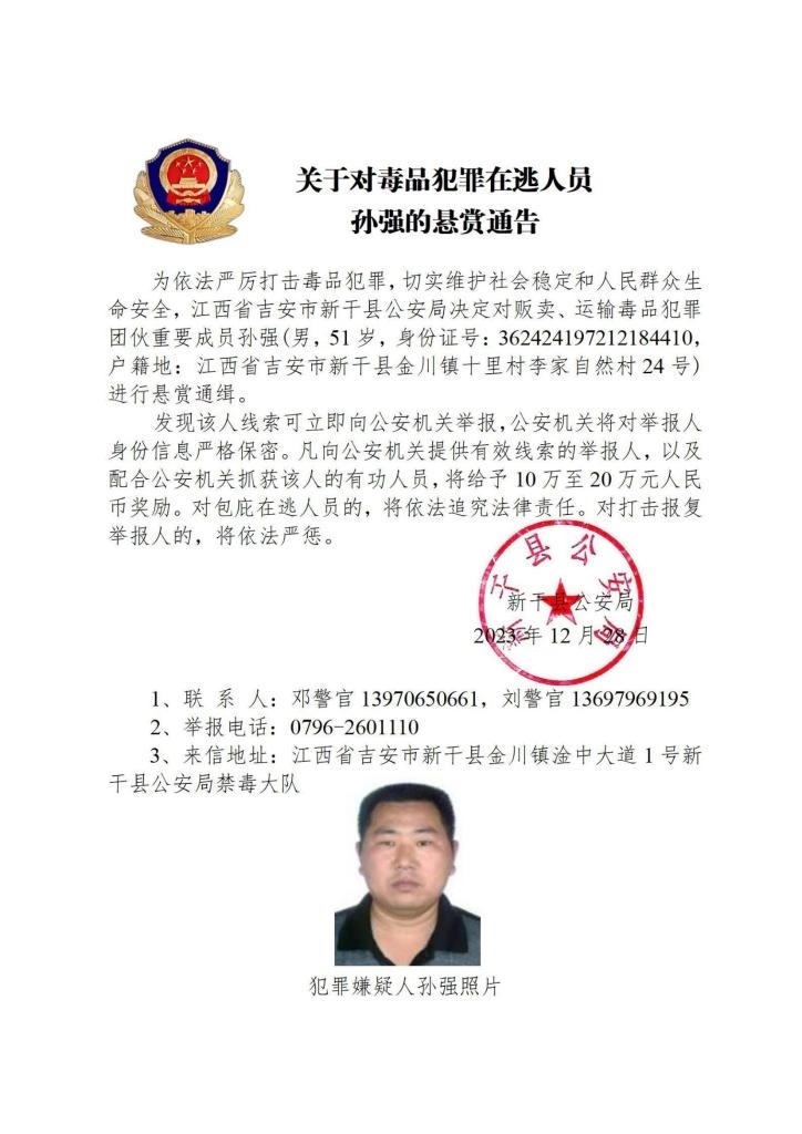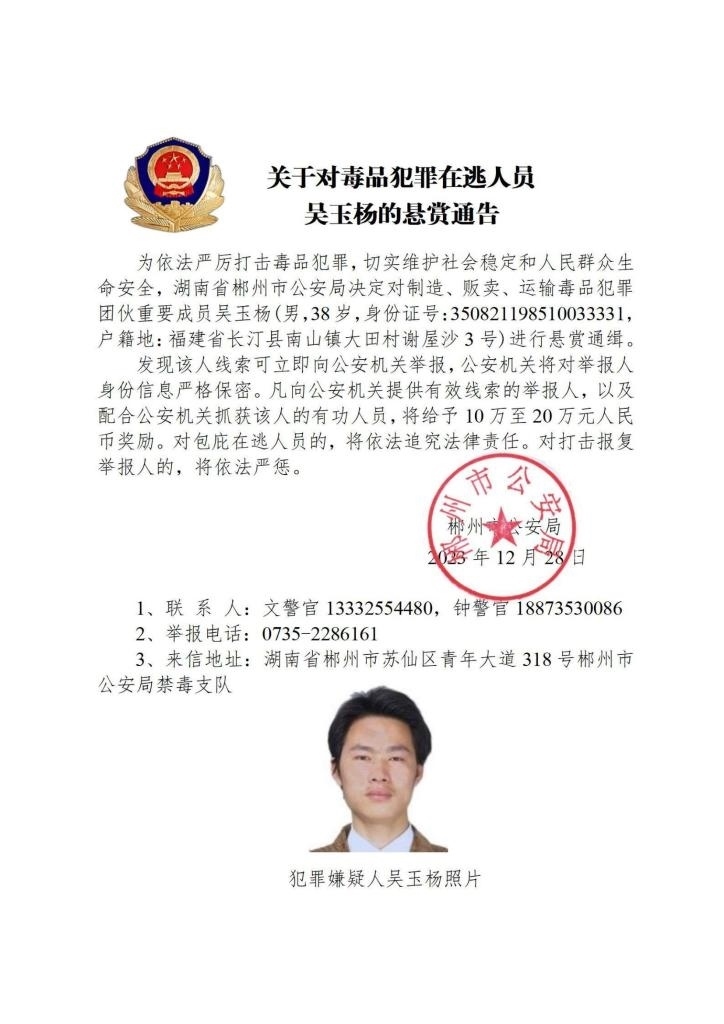 其中,湖南省郴州市公安局決定對(duì)張安龍、馬文祥、吳玉楊進(jìn)行公開懸賞通緝;湖南省株洲市公安局決定對(duì)楊金梅進(jìn)行公開懸賞通緝;江西省新干縣公安局決定對(duì)曾小勇、李國平、孫強(qiáng)進(jìn)行公開懸賞通緝;浙江省溫州市公安局決定對(duì)顏歡平進(jìn)行公開懸賞通緝;四川省遂寧市公安局決定對(duì)母朝東進(jìn)行公開懸賞通緝;貴州省黔東南州公安局決定對(duì)龍華進(jìn)行公開懸賞通緝。