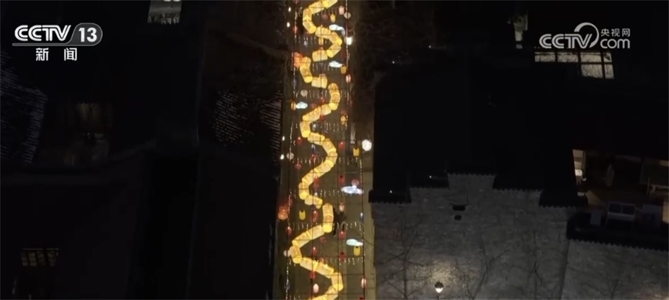 在老門(mén)東景區(qū),從空中俯瞰,一條長(zhǎng)130多米的龍燈貫穿在巷子里,蜿蜒盤(pán)旋點(diǎn)亮了城市夜空。