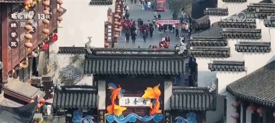 ??????新年將至,南京秦淮河畔的各式花燈陸續(xù)落成,與古建筑相互映襯。碧水繞城,畫舫穿行,裝扮后的古城如畫如詩。在“古秦淮”的牌坊上,魚躍龍門的造型立體生動。人們穿過牌坊,采買年貨,拍照留念。在夫子廟南側的門東歷史文化街區(qū),一條大龍造型的花燈依城墻而立。十二生肖燈組活靈活現(xiàn),讓古樸的街巷增添了迎新的色彩。