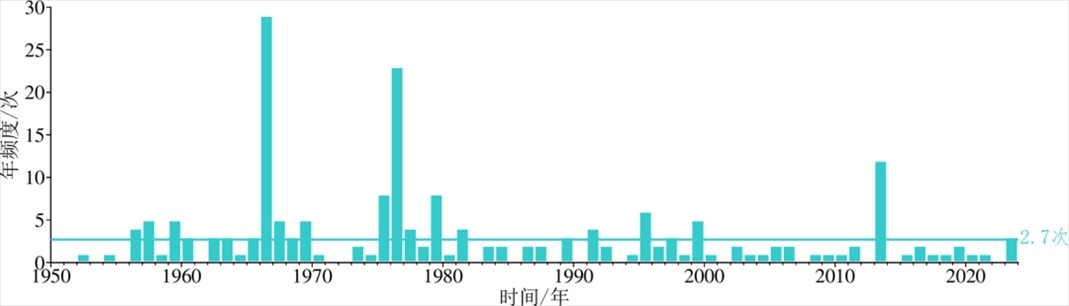2023年以來大陸東部及附近海域發(fā)生5級以上地震3次,分別為6月24日北部灣5.0級、8月6日山東平原5.5級和10月23日廣東南澳縣海域5.0級地震,地震活動水平較2022年(0次)顯著增強,為 2014 年以來活動頻次最高年份。