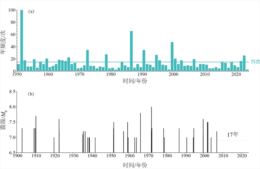 2023年臺灣及近海發(fā)生5級以上地震3次,最大為10月24日臺灣花蓮縣海域5.9級地震,活動水平較2022年(26次)顯著減弱,為2000年以來頻次最低的年份。且自2006年12月26日臺灣恒春海域7.2級地震后,臺灣7級以上地震已平靜17年,為1900年以來最長平靜。