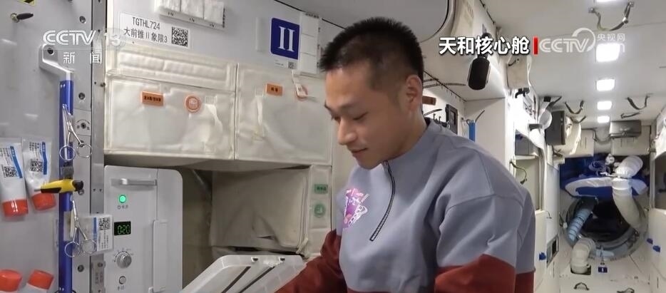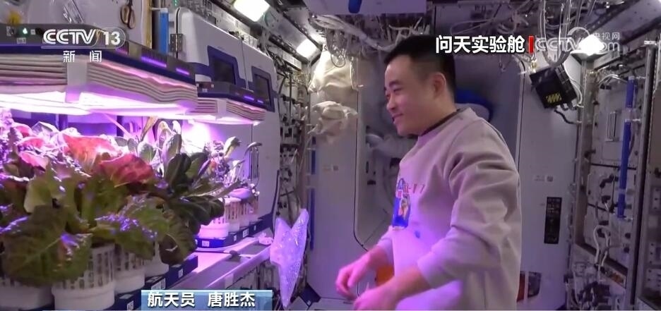 航天員 唐勝杰:你好,我正在對我們的櫻桃番茄進(jìn)行授粉。因?yàn)樘諞]有小蜜蜂,我就是那只小蜜蜂。大家看一看,這是我們的太空蔬菜,神十七乘組在“太空出差”期間,我們的太空菜園變得更大了,大家看看我們的蔬菜是不是長勢喜人?今天是新年的第一天,江新林為我們準(zhǔn)備了營養(yǎng)豐盛的太空午餐,但是我覺得今天應(yīng)該再增加一點(diǎn)綠色的、新鮮的蔬菜,午餐就會(huì)變得更豐盛了。大家可以看一看,看看我們的櫻桃番茄。誒,拿這兩杯,今天中午我們就吃這兩杯。
