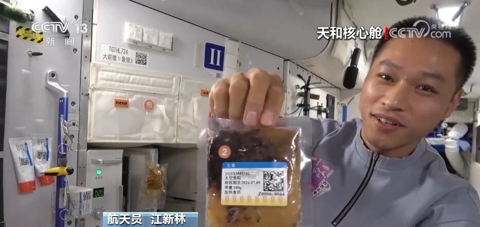 航天員 江新林:我是今天的太空美食家,讓我?guī)ьI(lǐng)大家一起來探索發(fā)現(xiàn)今天的太空美食。我們先看一下主食,熱乎乎的,看看里面都有什么吧,有01最愛吃的白米飯,小心燙哦,02愛吃的面條,我的炒飯。好了,把它粘在餐桌上。然后再讓我們看看我為他們準(zhǔn)備的驚喜??纯催@是什么?這是我們冬至特意結(jié)余的餃子,還有蔬菜副食。地面上的工作人員考慮得特別周到,按照個(gè)人的口味為我們準(zhǔn)備了美味的食品,而且將它們塑封包裝,給我們節(jié)余時(shí)間的時(shí)候又保證它的口味。這是網(wǎng)紅太空香粽,大家印象比較深刻吧,還有這個(gè)年糕也是特別好吃、特別美味,還有紅燴豬排,保證有足夠的蛋白質(zhì)攝入量。很豐盛。請看這里,我們特意留了一些新鮮的水果,看看都有什么吧,有美味的蘋果,還有葡萄,大家這個(gè)都特別愛吃,我們?nèi)齻€(gè)在一起分享一下。