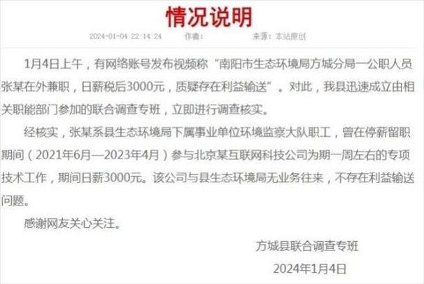 ·南陽調(diào)查“公務員兼職日薪三千”:停薪留職期間曾參與一周專項技術工作,不存在利益輸送。