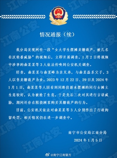 ·廣西南寧警方再通報“女大學生擺攤賣糖葫蘆被壯漢威脅”:3人被行拘。
