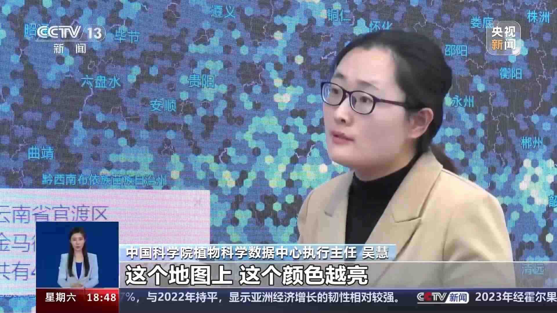 中國(guó)科學(xué)院植物科學(xué)數(shù)據(jù)中心執(zhí)行主任 吳慧:這個(gè)地圖上,這個(gè)顏色越亮,代表這個(gè)區(qū)域分布的我們的重點(diǎn)野生植物越多。