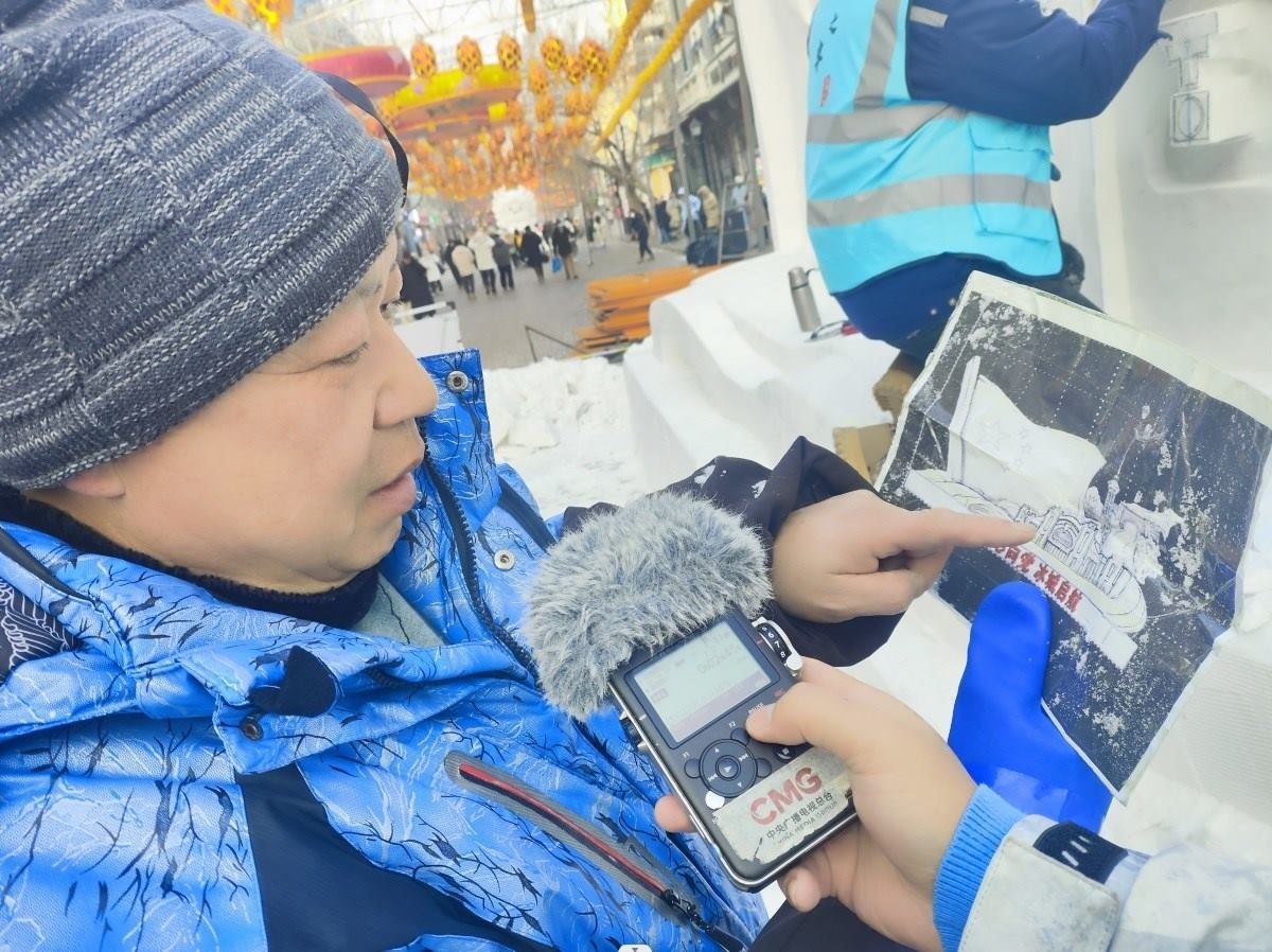 臧師傅向記者介紹在哈爾濱中央大街制作的另一個(gè)雪雕作品
