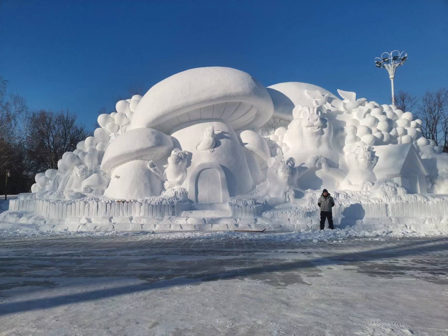 經(jīng)過一天雕刻即將完成的雪雕