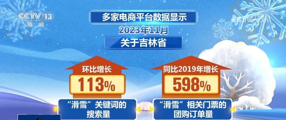 多家電商平臺數(shù)據(jù)顯示,2023年11月,關于吉林省“滑雪”關鍵詞的搜索量環(huán)比增長113%,“滑雪”相關門票的團購訂單量同比2019年增長了598%。