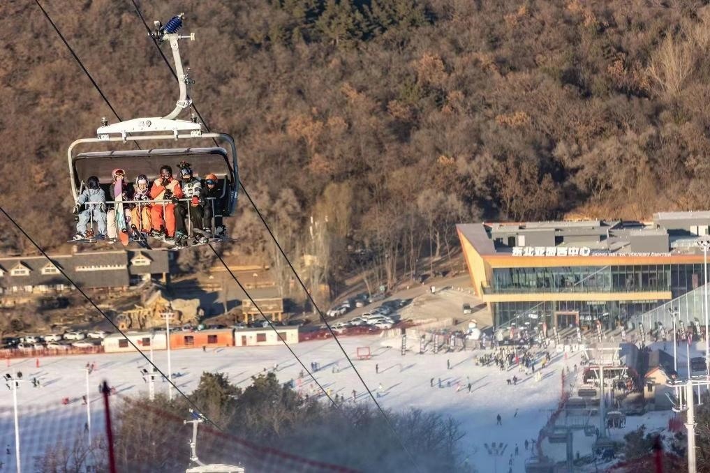 圖為游客在東北亞國際滑雪場乘坐纜車。