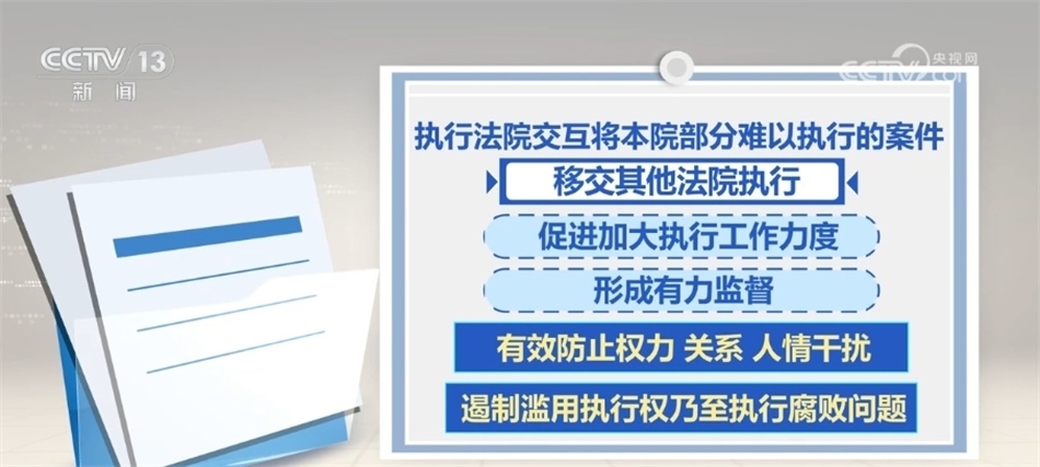 2023年10月,最高人民法院部署開展交叉執(zhí)行工作試點。據(jù)介紹,交叉執(zhí)行是指通過指定、提級執(zhí)行,執(zhí)行法院交互將本院部分難以執(zhí)行的案件移交其他法院執(zhí)行,促進(jìn)加大執(zhí)行工作力度,并形成有力監(jiān)督,有效防止權(quán)力、關(guān)系、人情干擾,遏制濫用執(zhí)行權(quán)乃至執(zhí)行腐敗問題。