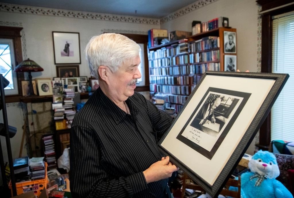 2019年1月29日,達(dá)維德·布思在位于美國(guó)新澤西的家中展示曾率費(fèi)城交響樂團(tuán)到中國(guó)首演的指揮尤金·奧曼迪的照片。