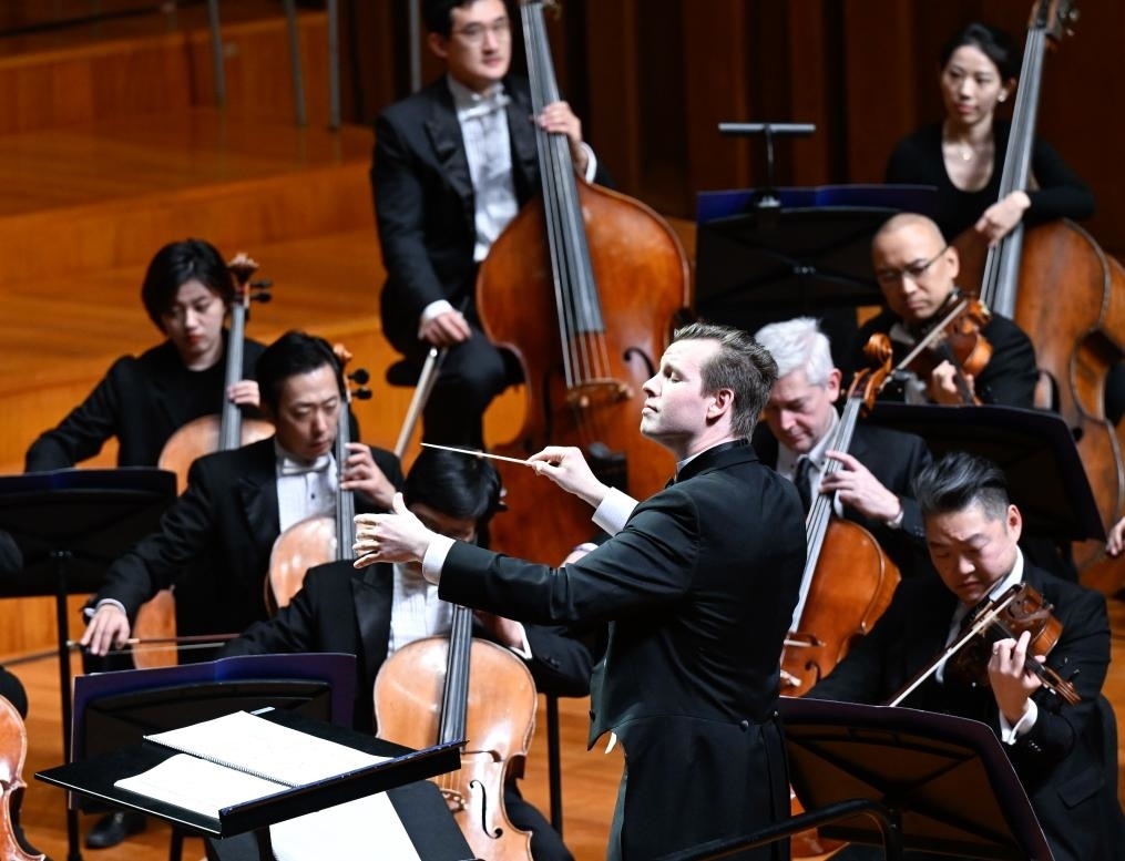 1月12日,在美國(guó)費(fèi)城,中國(guó)指揮家余?。ㄖ校┰?024年費(fèi)城交響樂團(tuán)新春音樂會(huì)上指揮。