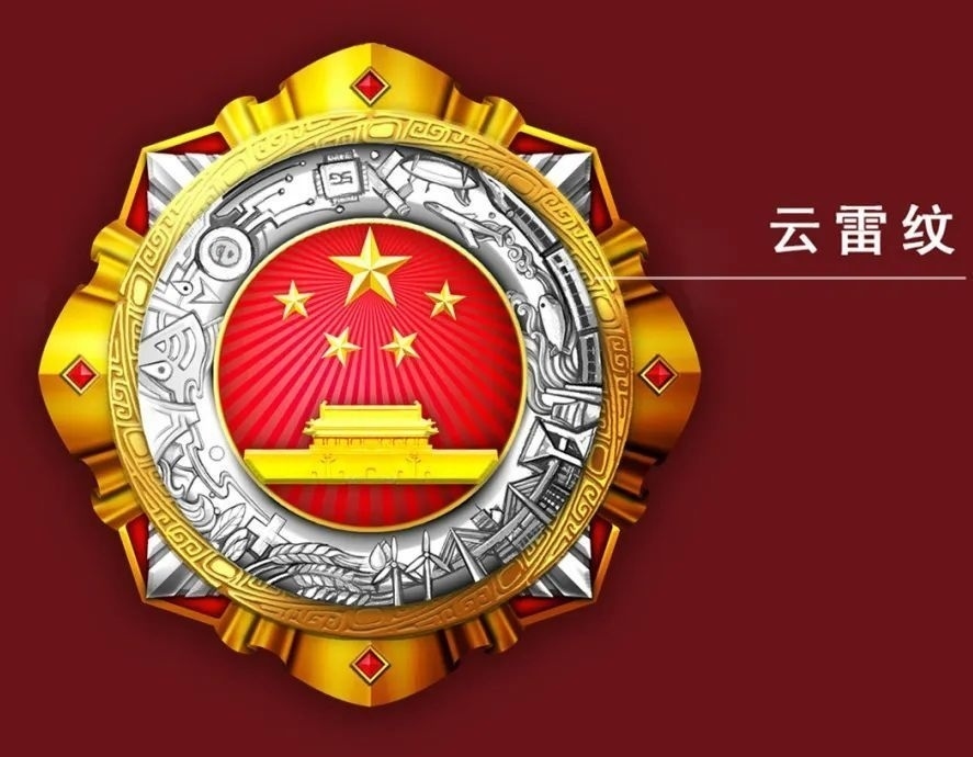 獎章章體整體是個國徽的形狀,中間則是經(jīng)典的五角星與天安門元素,象征國家級榮譽。外圍的旗幟寓意獲獎者的模范引領,在黨的領導下,為實現(xiàn)理想永遠奮斗。