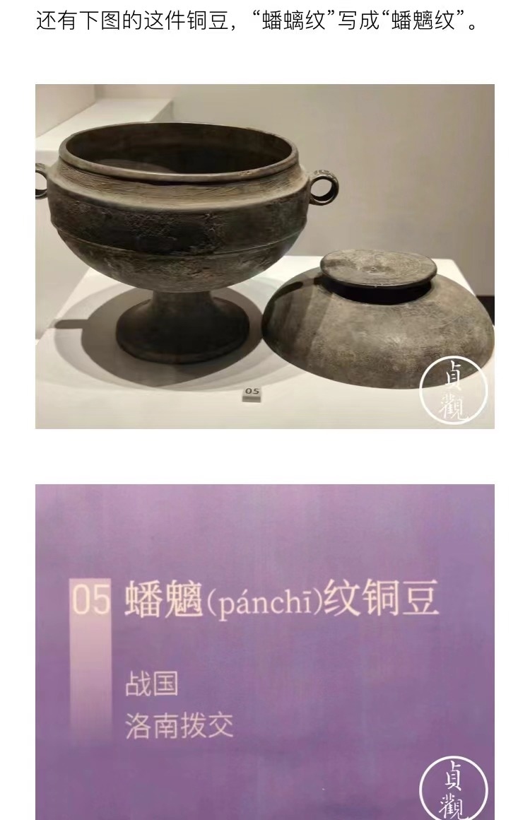 文章稱,秦漢館中很多展品不僅沒(méi)有英文標(biāo)識(shí),甚至連展品的基本信息都不全,有的文物名稱也被標(biāo)錯(cuò),如:“鷹獸相搏紋飾銅牌飾” 被誤寫為“銅鷹獸權(quán)博牌飾”;介紹一件銅豆的展品信息中,“蟠螭紋”誤寫成“蟠魑紋”。