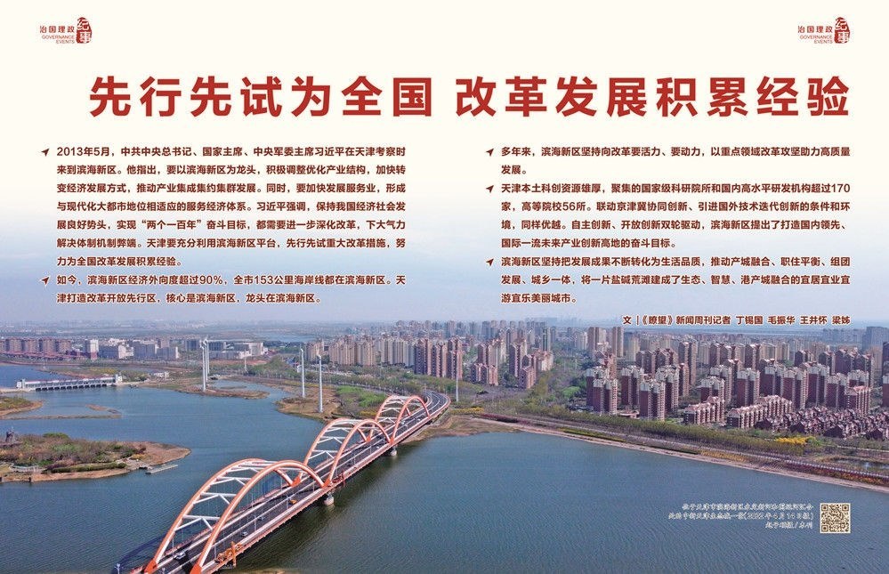 ◇2013年5月,中共中央總書(shū)記、國(guó)家主席、中央軍委主席習(xí)近平在天津考察時(shí)來(lái)到濱海新區(qū)。他指出,要以濱海新區(qū)為龍頭,積極調(diào)整優(yōu)化產(chǎn)業(yè)結(jié)構(gòu),加快轉(zhuǎn)變經(jīng)濟(jì)發(fā)展方式,推動(dòng)產(chǎn)業(yè)集成集約集群發(fā)展。同時(shí),要加快發(fā)展服務(wù)業(yè),形成與現(xiàn)代化大都市地位相適應(yīng)的服務(wù)經(jīng)濟(jì)體系。習(xí)近平強(qiáng)調(diào),保持我國(guó)經(jīng)濟(jì)社會(huì)發(fā)展良好勢(shì)頭,實(shí)現(xiàn)“兩個(gè)一百年”奮斗目標(biāo),都需要進(jìn)一步深化改革,下大氣力解決體制機(jī)制弊端。天津要充分利用濱海新區(qū)平臺(tái),先行先試重大改革措施,努力為全國(guó)改革發(fā)展積累經(jīng)驗(yàn)。