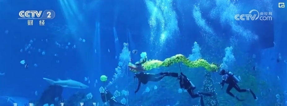 在鄭州一家海洋主題公園,4名潛水員化身“舞龍高手”,伴隨著他們的一招一式,一條金龍?jiān)谒序v挪起伏,向人們傳遞萬(wàn)物生輝的新春祝福。
