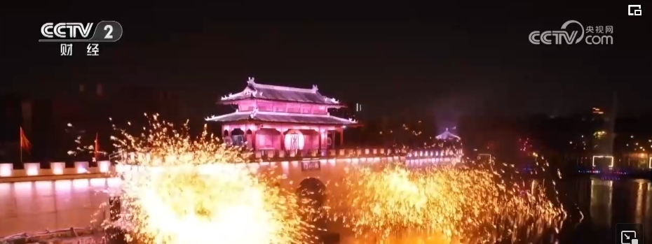 當(dāng)夜幕降臨,八朝古都開(kāi)封也在燈光的裝扮下流光溢彩。打鐵花是流傳于豫晉地區(qū)民間傳統(tǒng)的煙火,至今已傳承千余年。在清明上河園內(nèi),表演者先將鐵水舀起拋向空中,再用力擊打空中的鐵水,一時(shí)間鐵花飛濺、流星如瀑。園內(nèi),亭臺(tái)樓閣雕梁畫(huà)棟、虹橋清波舟船往來(lái),大型實(shí)景水上演出再現(xiàn)了北宋汴梁的盛世繁榮。