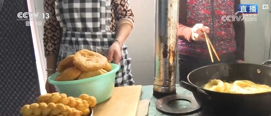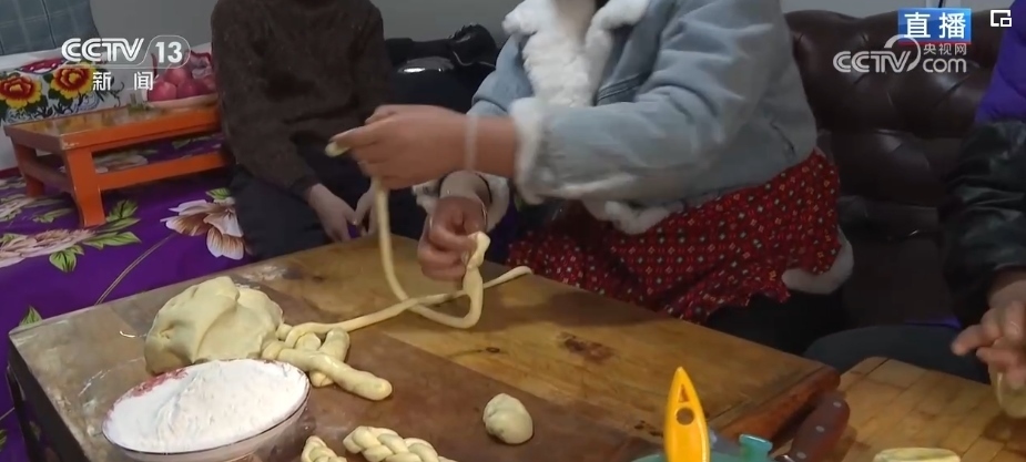 炸年饃是當(dāng)?shù)赝磷迦罕娪哟汗?jié)的傳統(tǒng)習(xí)俗。一家人齊上陣,這邊兩位大姐正在將發(fā)好的面揉好、揪出面劑子、搟成圓形、表面抹上清油,放進(jìn)油鍋里炸熟。對(duì)于土族群眾來(lái)說(shuō),進(jìn)入臘月之后就開始做年饃、宰年豬、置辦年貨,年味兒就濃了。炸年饃是當(dāng)?shù)厝罕娖碓感碌囊荒觑L(fēng)調(diào)雨順、五谷豐登、平安順?biāo)斓拿篮迷⒁?。制作年饃的面粉、菜籽油等材料都是政府給受災(zāi)群眾提供的物資。