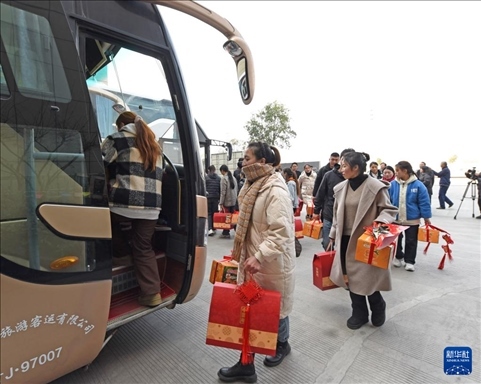1月28日,在浙江省臺(tái)州市仙居縣,一家企業(yè)的甘肅籍員工登上返鄉(xiāng)過(guò)年專車(chē)。新華社發(fā)(王華斌 攝)