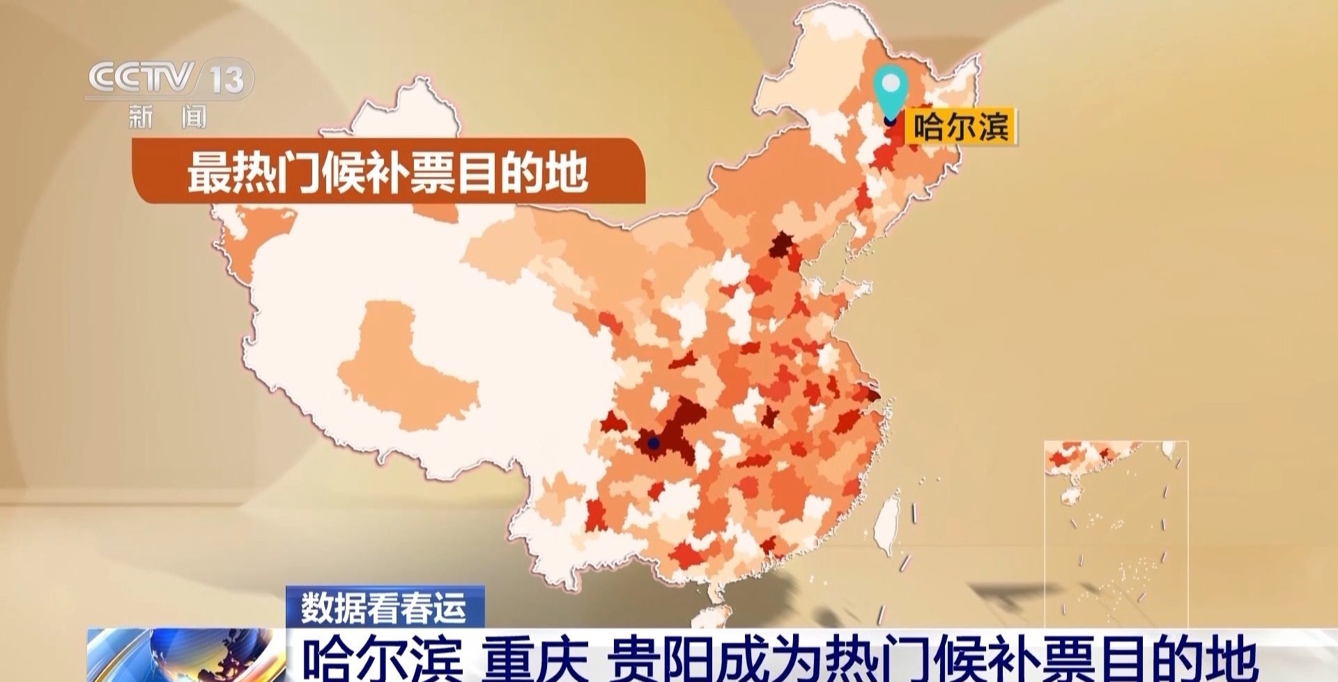 根據(jù)12306數(shù)據(jù)平臺(tái)的候補(bǔ)票情況看,目前哈爾濱成為最熱門的候補(bǔ)票目的地。哈爾濱不單單吸引南方人,天津、北京、廣州、沈陽這四個(gè)城市到哈爾濱的候補(bǔ)票數(shù)量也是排名靠前。此外,重慶和貴陽也是頗為熱門的候補(bǔ)票目的地,從廣州、深圳、東莞去往重慶和貴陽的車票也很搶手。