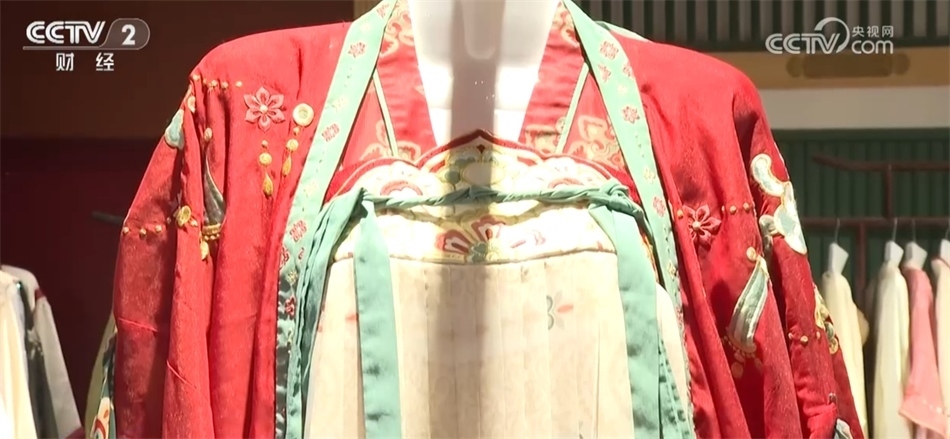 總臺記者 秦祎:我旁邊的這件就是店內(nèi)最受歡迎的唐裝之一——花想容,這件衣服里面是一件唐裝的基礎(chǔ)款造型齊胸襦裙,披上外披則是貴妃造型,如果擔心天氣冷可以像我一樣加上斗篷。