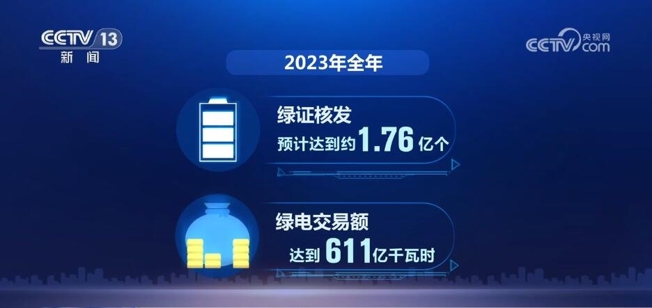 全覆蓋,是2023年我國綠電消費的一大關(guān)鍵詞。通過給已建檔立卡的可再生能源發(fā)電項目全部核發(fā)綠證,我國成為全球最大的綠證供應(yīng)市場。全年綠證核發(fā)預(yù)計達到約1.76億個,綠電交易額達到611億千瓦時,分別是2022年的7.8倍和10.5倍。
