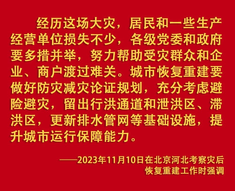 2023年汛期以來,我國(guó)華北、東北等地出現(xiàn)極端降雨,引發(fā)洪澇和地質(zhì)災(zāi)害。習(xí)近平一直牽掛著受災(zāi)群眾,高度重視防汛抗洪救災(zāi)和災(zāi)后恢復(fù)重建工作,多次作出重要指示批示,要求有關(guān)地方和部門全力保障人民群眾生命財(cái)產(chǎn)安全,盡快恢復(fù)災(zāi)區(qū)正常生產(chǎn)生活秩序。2023年9月上旬,習(xí)近平前往黑龍江尚志市看望慰問受災(zāi)群眾;11月,北方入冬之際,習(xí)近平又來到北京、河北受災(zāi)較重的相關(guān)地區(qū),看望慰問受災(zāi)群眾,檢查指導(dǎo)災(zāi)后恢復(fù)重建工作。