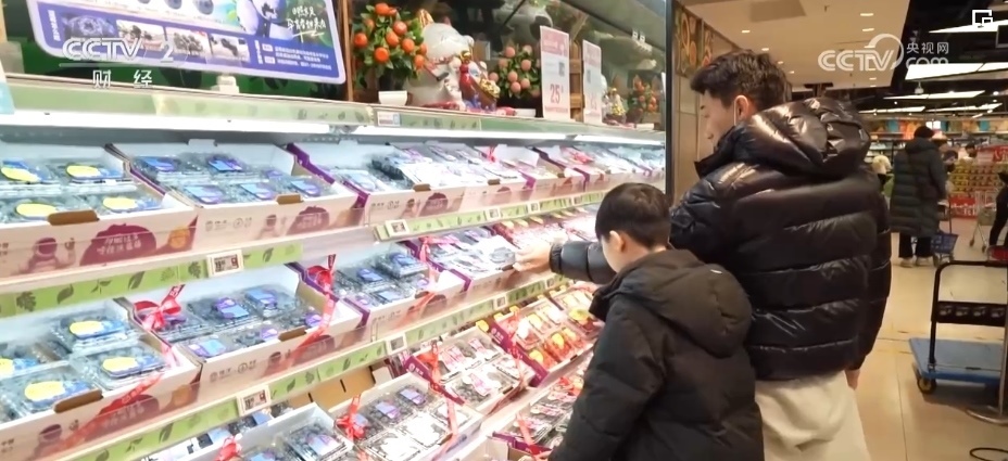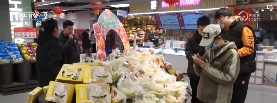 除了蘋果,各類葡萄、柑橘、車?yán)遄?、草莓、藍(lán)莓、菠蘿、榴蓮等水果也大量上市。僅記者采訪的這家生鮮超市,新奇特品種相比2023年,就有5%—10%的增長,春節(jié)前更是有100多款水果在店內(nèi)銷售,豐富了百姓的“果盤子”。