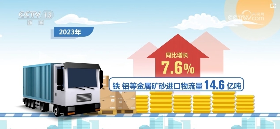 2023年,進(jìn)口物流總額18.0萬億元,同比增長(zhǎng)13.0%,進(jìn)口物流量保持快速恢復(fù)態(tài)勢(shì)。原油、天然氣、煤炭等能源產(chǎn)品進(jìn)口物流量11.6億噸,同比增長(zhǎng)27.2%,鐵、鋁等金屬礦砂進(jìn)口物流量14.6億噸,同比增長(zhǎng)7.6%。