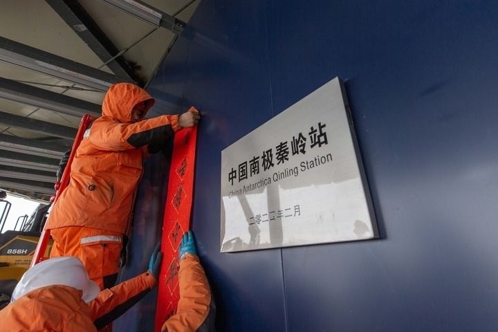 2024年2月9日,工作人員在中國南極秦嶺站貼對聯(lián)。新華社記者 周圓 攝