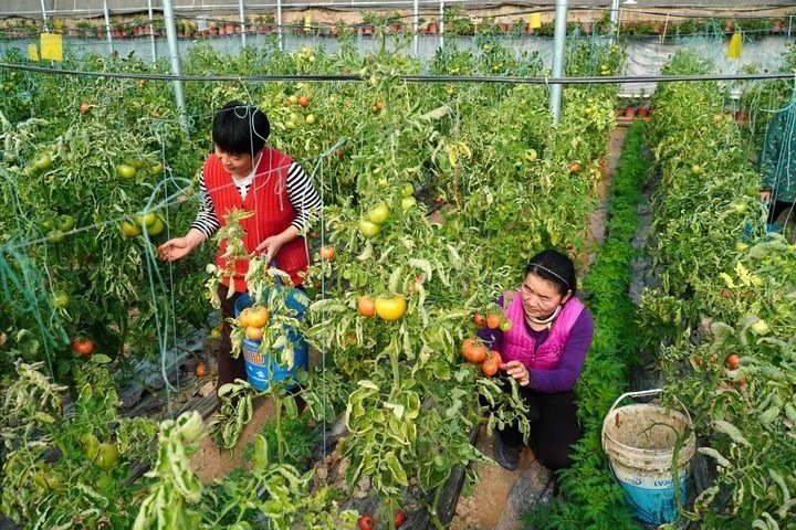 2024年2月6日,在山東省臨邑縣臨南鎮(zhèn),蔬菜大棚種植戶在收獲西紅柿。新華社記者 徐速繪 攝
