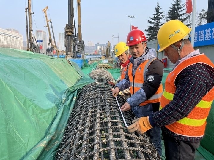 2024年2月9日,在中建八局承建的濟南軌道交通7號線一期工程的龍奧大廈站施工現(xiàn)場,質(zhì)量工程師劉學(xué)(中)在檢查鋼筋籠焊接質(zhì)量。新華社發(fā)