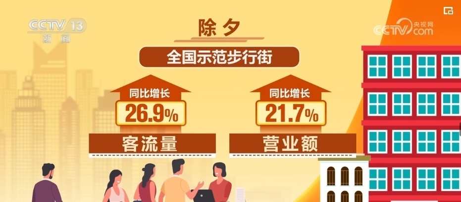據商務部大數據監(jiān)測,2024年除夕,部分重點大型超市即時零售銷售額同比增長約20%。除夕當天,重點電商平臺在線餐飲銷售額同比增長40.8%,全國示范步行街客流量、營業(yè)額同比分別增長26.9%和21.7%。