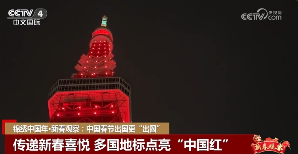 為歡慶春節(jié),多國地標建筑都點亮了“中國紅”。英國倫敦的巨型摩天輪“倫敦眼”亮起紅色和金色燈光,象征幸福吉祥;在日本東京,東京塔換上一身紅裝,為龍年送上祝福;加拿大最大城市多倫多市的地標建筑加拿大國家電視塔也在落日一個小時后開始“亮紅”,迎接龍年新春的到來。