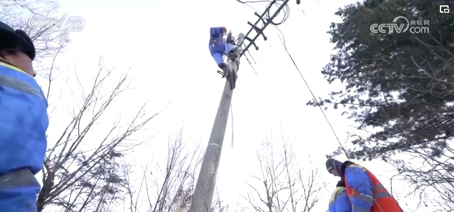工友們處理完樹(shù)倒后,兩位老師傅又趕緊系上安全帶穿上腳扣又爬上通信電桿排查隱患。