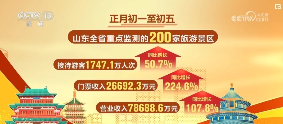 正月初一至初五,山東全省重點(diǎn)監(jiān)測的200家旅游景區(qū),累計接待游客超過1747萬人次,門票收入超2.6億元,營業(yè)收入超7.8億元,與上年同期相比,分別增長50.7%、224.6%、107.8%。