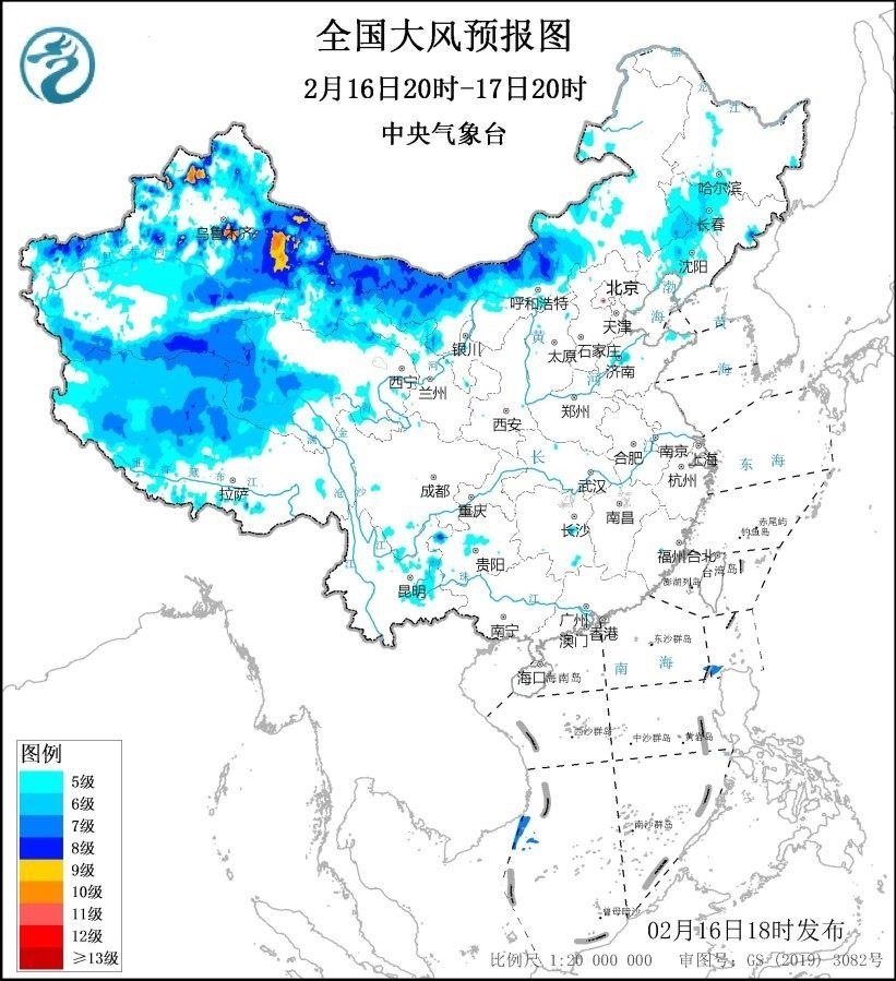 中央氣象臺2月16日18時發(fā)布大風(fēng)藍(lán)色預(yù)警。