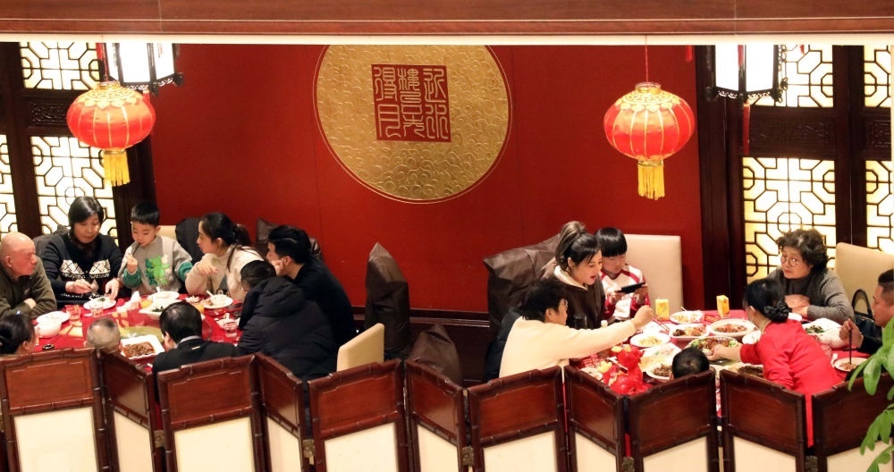 2024年2月9日,人們在江蘇省蘇州市一家餐館內(nèi)享用團圓飯。新華社發(fā)(杭興微 攝)