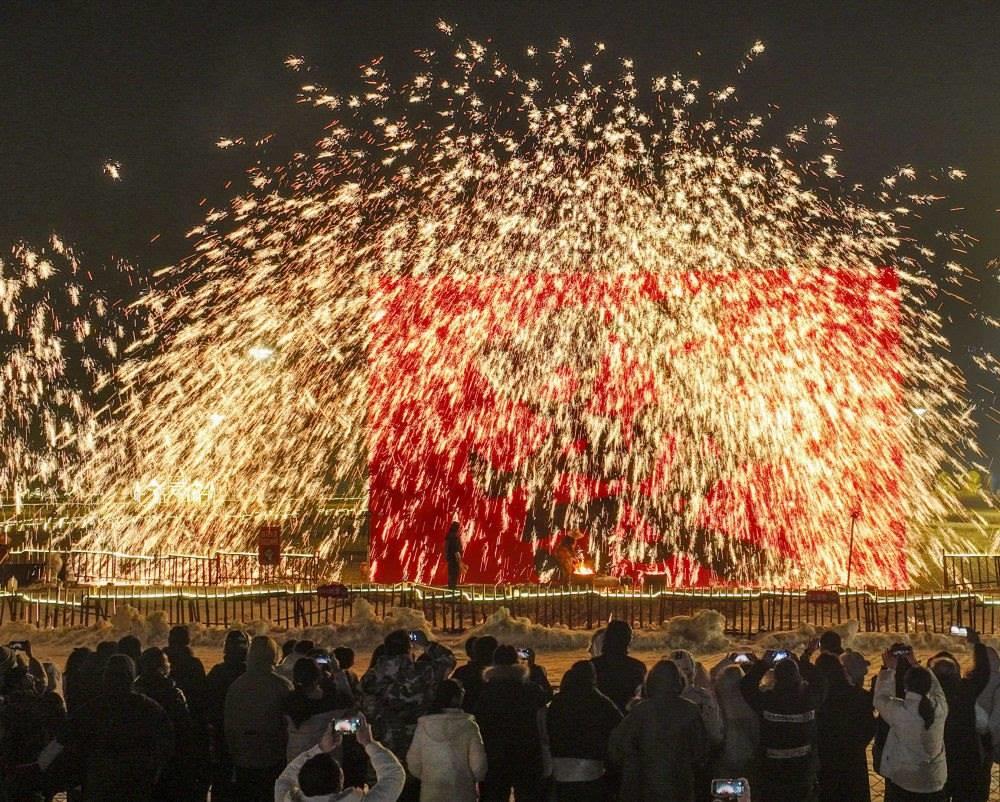 2024年2月10日,游客在河北省遵化市團瓢莊鎮(zhèn)山里各莊景區(qū)觀看打鐵花表演。新華社發(fā)(劉滿倉 攝)